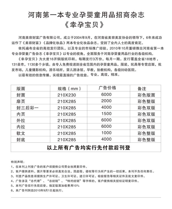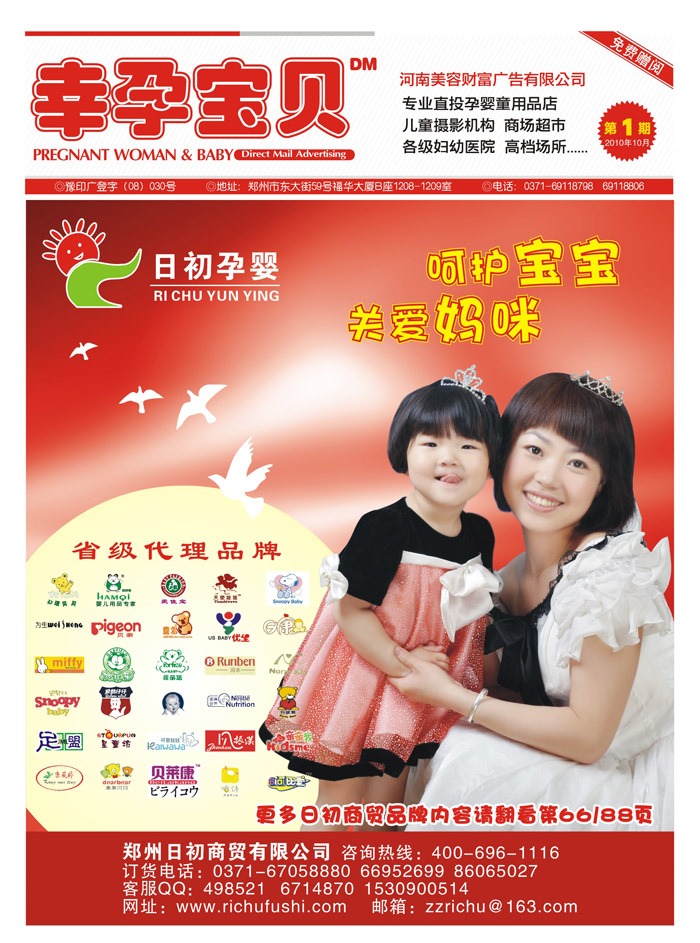 依托遍布全省的高效發(fā)行團隊,以及專業(yè)的市場推廣經(jīng)驗,2010年10月重磅推出河南省第一本專業(yè)孕嬰童廣告雜志《幸孕寶貝》以專業(yè)的視角,全面服務于河南孕嬰童用品行業(yè)的各級機構(gòu)。