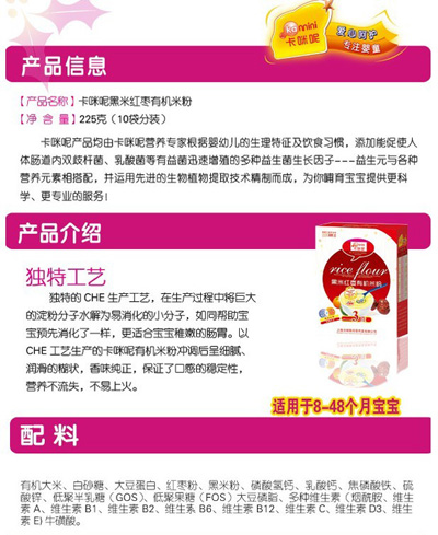 卡咪呢有機米粉系列是專為中國寶寶設計的營養(yǎng)輔食,選用有機大米,科學搭配維生素AD等維生素,還特別添加牛磺酸、DHA、AA等有助智力發(fā)育的營養(yǎng)成分,富含15種營養(yǎng)素,F上?ㄟ淠啬笅胗闷酚邢薰久嫦蛉珖瞻资袌鰠^(qū)域誠招卡咪呢有機米粉代理商。