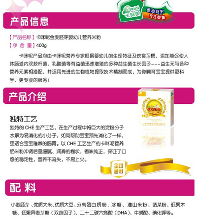 卡咪呢乳清蛋白嬰幼兒營(yíng)養(yǎng)米粉是上?ㄟ淠啬笅胗闷酚邢薰酒煜庐a(chǎn)品,精選優(yōu)質(zhì)大米制作,特別添加乳清蛋白和益生元,提高寶寶抵抗力,促進(jìn)寶寶changdao的消化吸收,上市以來(lái)廣受父母消費(fèi)者的青睞。