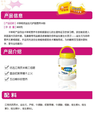 卡咪呢乳清蛋白嬰幼兒營養(yǎng)米粉是上?ㄟ淠啬笅胗闷酚邢薰酒煜庐a(chǎn)品,精選優(yōu)質(zhì)大米制作,特別添加乳清蛋白和益生元,提高寶寶抵抗力,促進(jìn)寶寶changdao的消化吸收,上市以來廣受父母消費者的青睞。