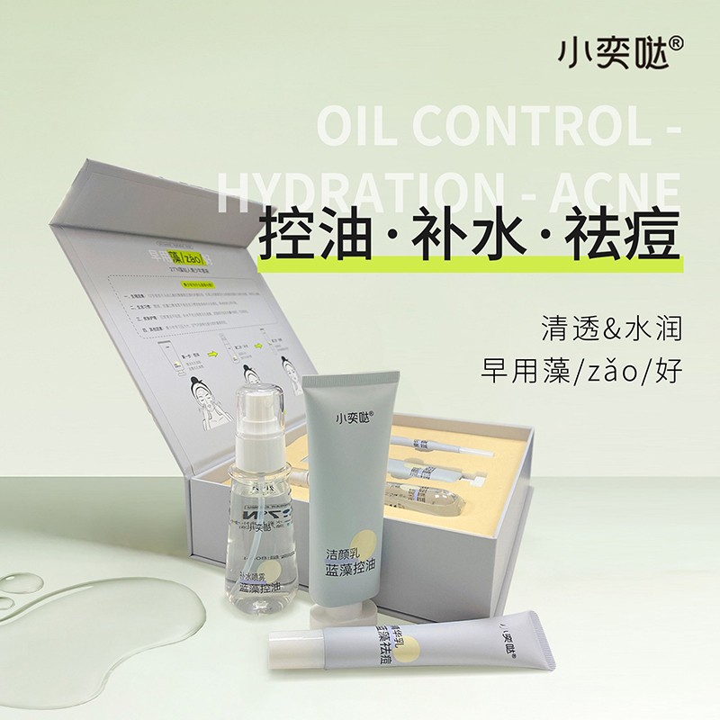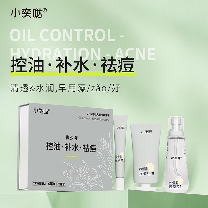 小奕噠青少年藍藻控油補水祛痘三件套,包含:藍藻控油潔顏乳+藍藻控油補水噴霧+藍藻祛痘精華乳,控油、補水、祛痘,清透水潤。