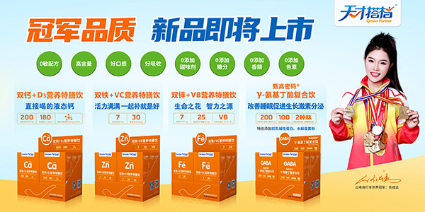 璀璨登場,精準(zhǔn)出擊!天才搭檔強(qiáng)勢推出雙鈣+D3營養(yǎng)特膳飲、雙鐵+VC營養(yǎng)特膳飲、雙鋅+VB營養(yǎng)特膳飲、甄高密碼γ-氨基丁酸復(fù)合飲四款配方單品,高品質(zhì),高標(biāo)準(zhǔn),高含量,引爆母嬰行業(yè)新趨勢!